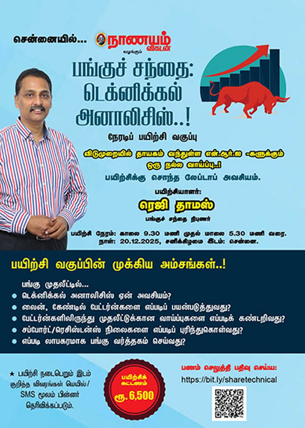 நாணயம் விகடன் வழங்கும் ‘பங்குச் சந்தை: டெக்னிக்கல் அனாலிசிஸ் பயிற்சி வகுப்பு சென்னையில் நடக்கிறது. இந்தப் பயிற்சியை பங்குச் சந்தை நிபுணர் ரெஜி தாமஸ் அளிக்கிறார். விடுமுறையில் தாயகம் வந்துள்ள என்.ஆர்.ஐ-களுக்கும் ஒரு நல்ல வாய்ப்பாக இந்தப் பயிற்சி இருக்கும்.