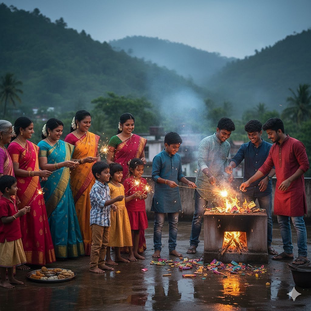 தீபாவளி அன்று காலை பெரும்பாலும் மழையோடு தான் விடியும். மொட்டை மாடியில் அந்த தூறல் மழையில் சிறிது நனைந்தவாறே, மலைகள் சூழ்ந்த எங்க சொந்த ஊரை வேடிக்கைப் பார்த்தப்பின், அந்தக் குளிரில் எண்ணெய் தேய்த்து குளித்துவிட்டு, சாமி கும்பிட்டு, புது டிரஸ் போட்டு மற்றவர்களிடம் சென்று காட்டி ‘எப்படி இருக்கு.. எப்படி இருக்கு’ ன்னு கேட்டு கொஞ்சம் அலட்டிட்டு, சாப்பிட்டுட்டு, மாமா பிள்ளைகள், பிரண்ட்ஸ், தம்பி பிரண்ட்ஸ் என எல்லாருடைய டிரஸ்ஸையும் பார்த்து கமெண்ட் அடிச்சிட்டு, நமக்கு பிடிச்ச பலகாரத்தை போகும்போது வரும்போதெல்லாம் சாப்பிட்டு, இடையில் டிவியில் சிறப்பு நிகழ்ச்சிகள் பார்த்து, அப்படின்னு ஒரே பிசி தான் அன்று முழுவதும். ஒரு முறை, தம்பியின் நண்பன் ரொம்ப ஸ்டைலா, மாடர்னா ஒரு டிரஸ் போட்டுட்டு வந்தான்.