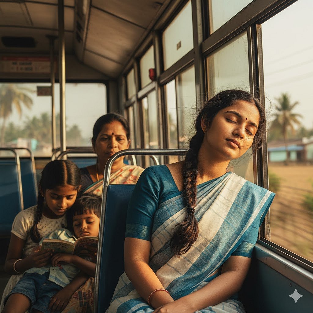 பேருந்தின் சன்னலோரத்தில் தலை சாய்ந்திருந்தாள் அவள். வெளிக்காற்று இதமாய் தலை கோதிக் குழல் கலைத்து விளையாடியது .அவளுக்கு முன் இருக்கையில் ஒரு அம்மா தன் இரு குழந்தைகளுடன் அமர்ந்திருந்தாள்.ஏறத்தாழ பத்துவயதில் ஒரு சிறுமி, அவளை விட சுமார் மூன்று வயதில் சிறியவனாக ஒரு சிறுவன்..