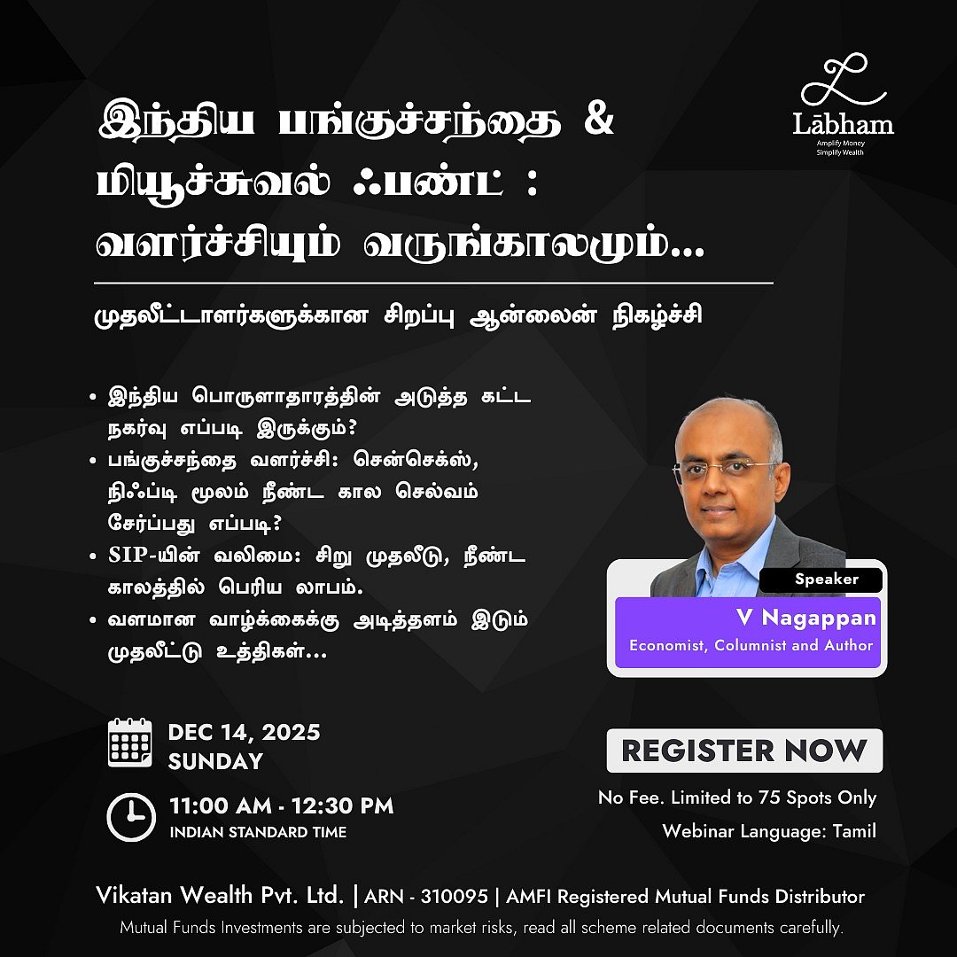 இந்த ஆன்லைன் மீட்டிங்கில் கலந்துகொள்ள வேண்டும் எனில், பின்வரும் லிங்கினை https://labham.money/webinar-dec-14-2025?utm_source=vikatan_com&utm_medium=article&utm_campaign=webinar_dec14_2025 சொடுக்கி, தங்கள் பெயரைப் பதிவு செய்துகொள்வது அவசியம். பெயரைப் பதிவு செய்துகொள்கிறவர்களுக்கு மட்டுமே இந்த ஆன்லைன் மீட்டிங்கில் கலந்துகொள்வதற்கான லிங்க் அனுப்பப்படும்.