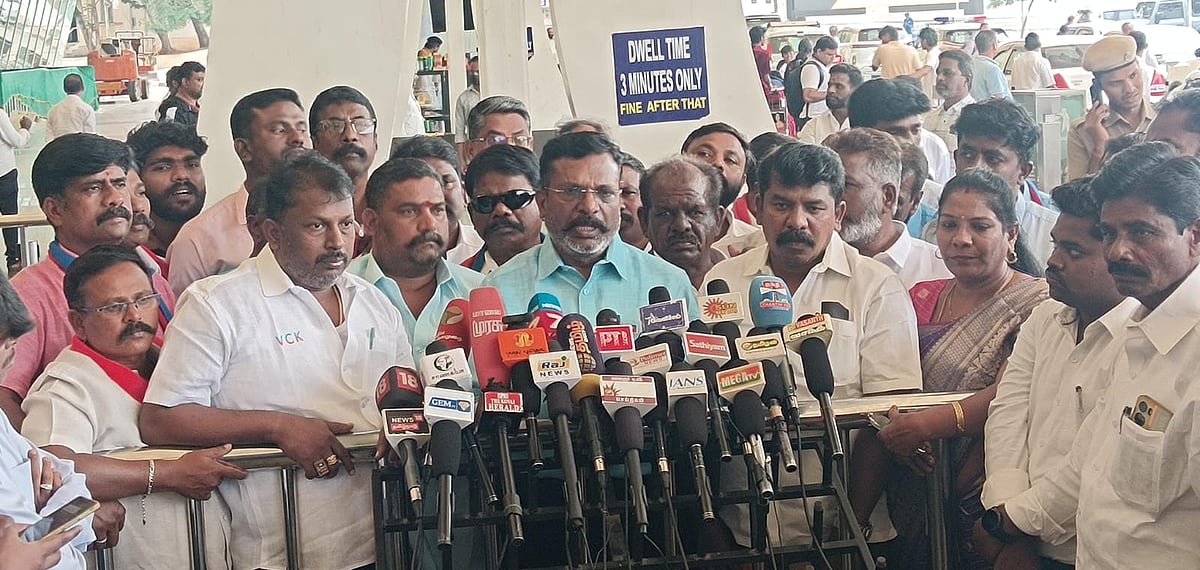 கோவை விமான நிலையத்தில் விடுதலை சிறுத்தைகள் கட்சித் தலைவர் திருமாவளவன் செய்தியாளர்களைச் சந்தித்தார்.