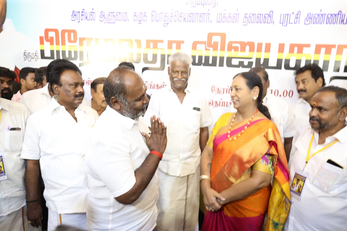 இந்த நிலையில் தமிழகம் முழுவதும் சுற்றுப்பயணம் மேற்கொண்டுள்ள தேமுதிக பொதுச் செயலாளர் பிரேமலதா விஜயகாந்த் மதுரை வந்துள்ள நிலையில், தேமுதிக நிகழ்ச்சி நடைபெறும் இடத்திற்கு எதிர்க்கட்சி துணைத்தலைவரும், அதிமுக முன்னாள் அமைச்சருமான ஆர்.பி.உதயகுமார் வருகை தந்தார். அங்கிருந்த விஜயகாந்த்தின் படத்திற்கு பிரேமலதாவுடன் சேர்ந்து ஆர்.பி உதயகுமார் மலர் தூவி மரியாதை செலுத்தி வணங்கினார். பிறகு இருவரும் தனியாக பேசிக்கொண்டனர்.