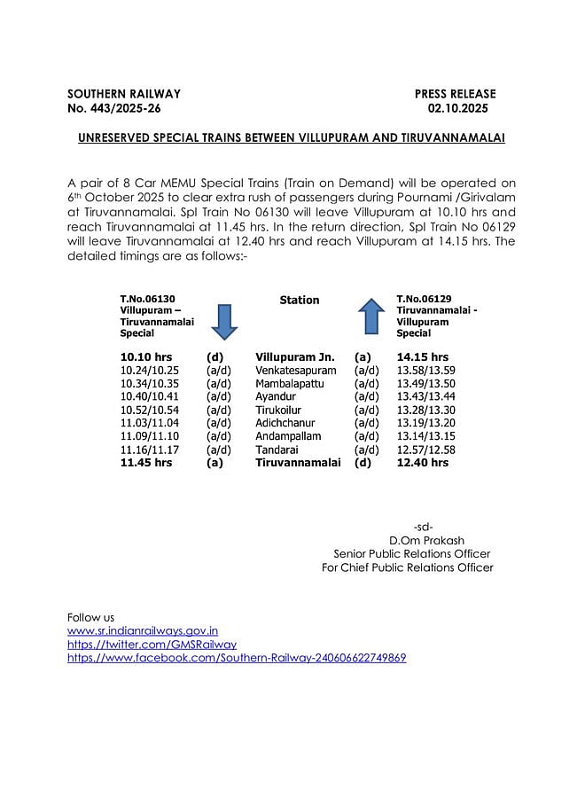 அக்டோபர் 6 ஆம் தேதி காலை 10.10 மணிக்கு விழுப்புரத்தில் இருந்து புறப்படும் மெமு ரயில், திருக்கோயிலூர் வழியாக திருவண்ணாமலைக்கு காலை 11.45 மணியளவில் சென்றடையும்.