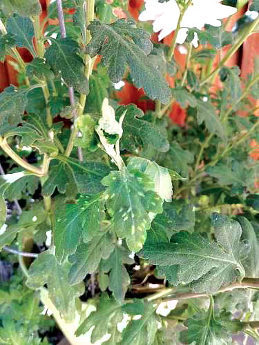 மலர் செடிகளைத் தாக்கக்கூடிய இலைப்பேன்கள் இலைகளின் நடு நரம்பில் உள்ள சாற்றையும், பூக்களில் உள்ள சாற்றையும் உறிஞ்சி எடுப்பதால், அவை காய்ந்து போகும். இதனால், இலைகளிலும் பூக்களிலும் ஆங்காங்கே வெள்ளை நிறத்தில் பட்டை போன்ற கோடுகள் தோன்றும். இலைகள் மேல்நோக்கிச் சுருள ஆரம்பிக்கும்.