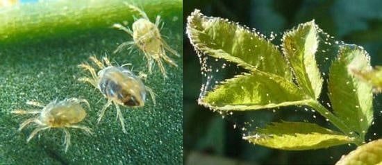 இரண்டு புள்ளிகள் கொண்ட செம்பேன் சிலந்திகள், இலைகளுக்குப் பின்புறம் நூலாம்படை போன்ற வடிவமைப்பை ஏற்படுத்தி, உள்ளே சென்று அமர்ந்து கொள்ளும். எந்த மாதிரியான பூச்சிக்கொல்லிகளைத் தெளித்தாலும் நூலாம்படையில்தான் படும் (இந்தப் பூச்சிகள் அதிக அளவில் இனப்பெருக்கம் செய்யும். இவை, இலையின் பின்புறம் உள்ள சாற்றை உறிஞ்சுவதால் இலைகள் பாதிக்கப்படும். இதனால் செடியின் வளர்ச்சி குன்றி பூக்கள் உருவாவதிலும் பாதிப்பு ஏற்படும்).
