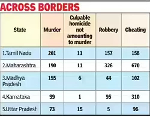 உத்தர பிரதேசம் 3,206, பிகாா் 2,862, மகாராஷ்டிரம் 2,208, மத்தியப் பிரதேசம் 1,832, ராஜஸ்தான் 1,804. தமிழ்நாட்டில் 1681 கொலை வழக்குகள் பதிவாகியுள்ளன. புதுச்சேரியில் 28 கொலை வழக்குகள் பதிவாகியுள்ளன.