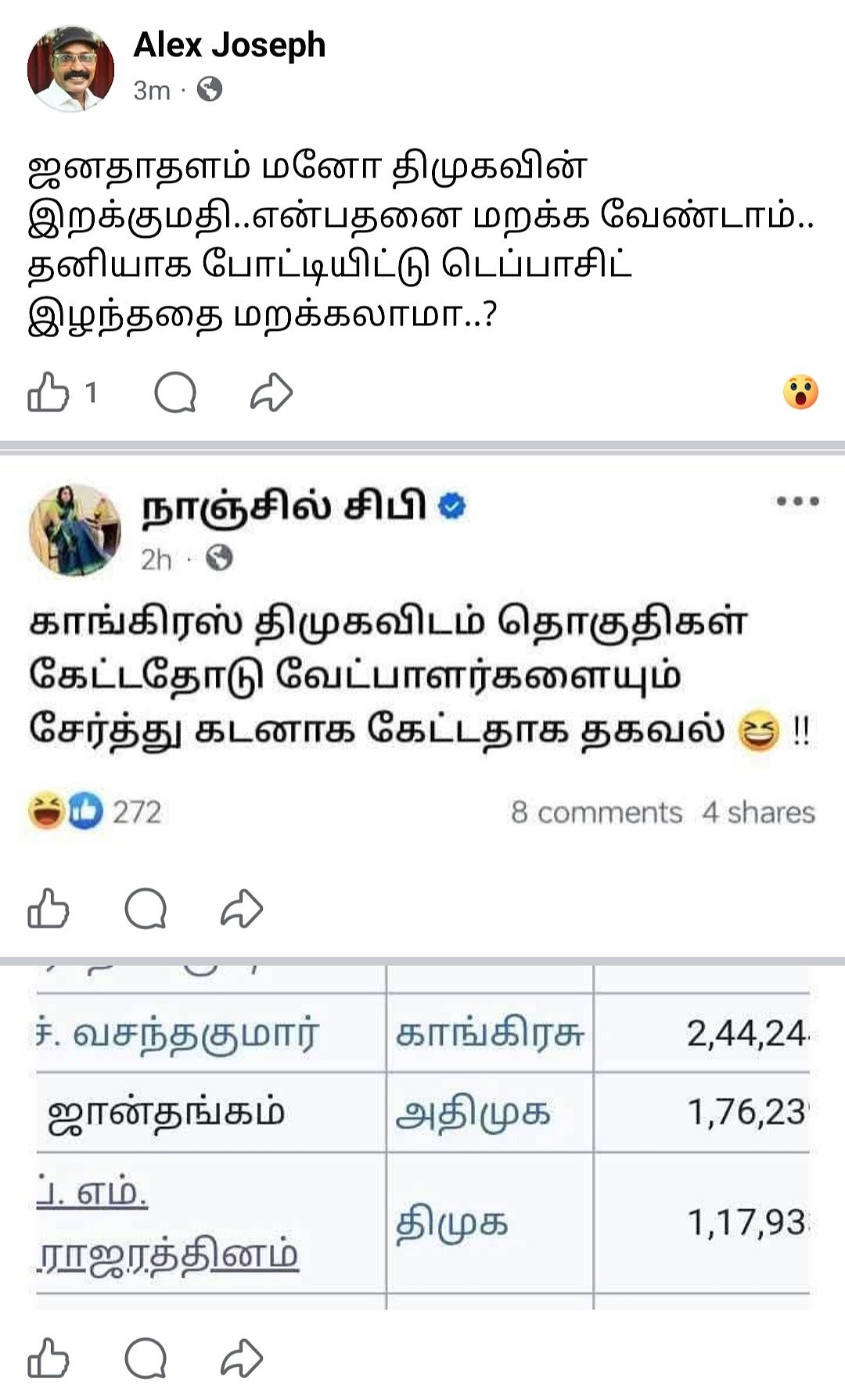 நாகர்கோவில் நகர காங்கிரஸ் முன்னாள் தலைவர் அலெக்ஸ் ஜோசப், "ஜனதா தளம் கட்சியில் இருந்து தி.மு.க இறக்குமதி செய்த நபர்தான் மனோ தங்கராஜ் என்பதை மறக்க வேண்டாம். தனியாகப் போட்டியிட்டு டெப்பாசிட் இழந்ததை மறக்கலாமா?" என்று பதிவிட்டிருந்தார்.