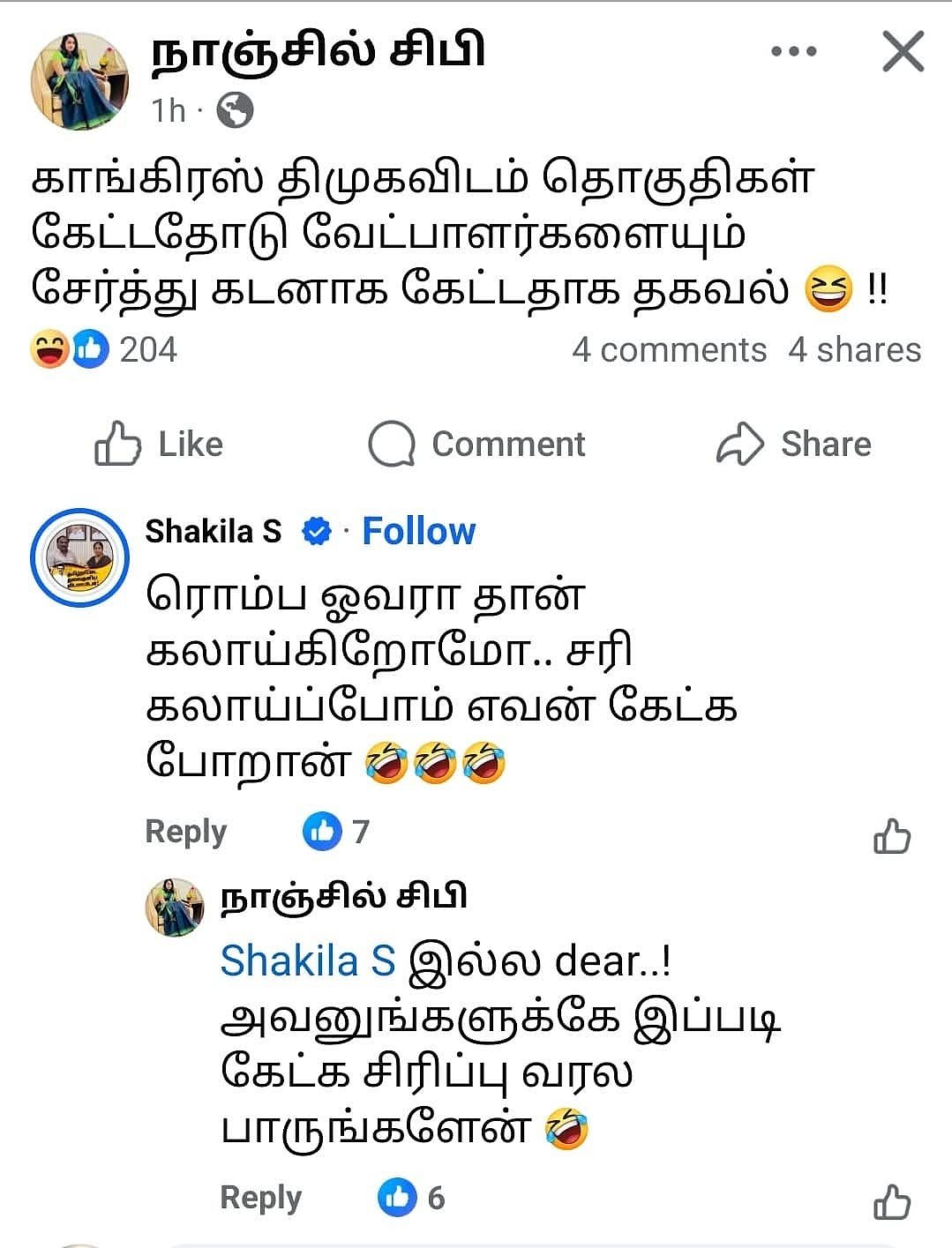 இதற்கிடையே கன்னியாகுமரி மேற்கு மாவட்ட தி.மு.க மகளிர் அணி அமைப்பாளர் நாஞ்சில் சிபி தனது முகநூல் பதிவில், "காங்கிரஸ் தி.மு.க-விடம் தொகுதிகள் கேட்டதோடு வேட்பாளர்களையும் சேர்த்துக் கடனாகக் கேட்டதாகத் தகவல்" என்று கிண்டலடித்திருந்தார்.